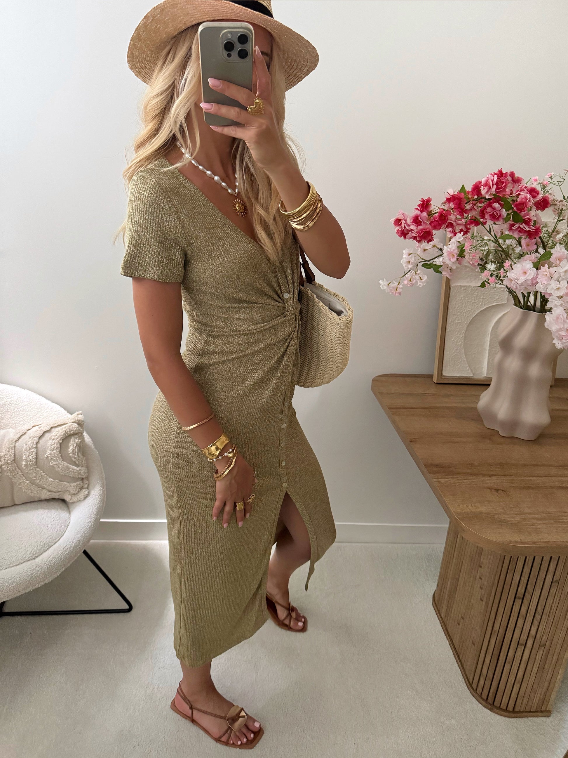 The minimalist, straight-cut SAO maxi dress elegantly accentuates your silhouette. Its ribbed fabric, short sleeves, button placket, and front slit add character and comfort. The tie at the waist structures your silhouette. This versatile piece can be worn with sandals or heels for a modern and timeless look.