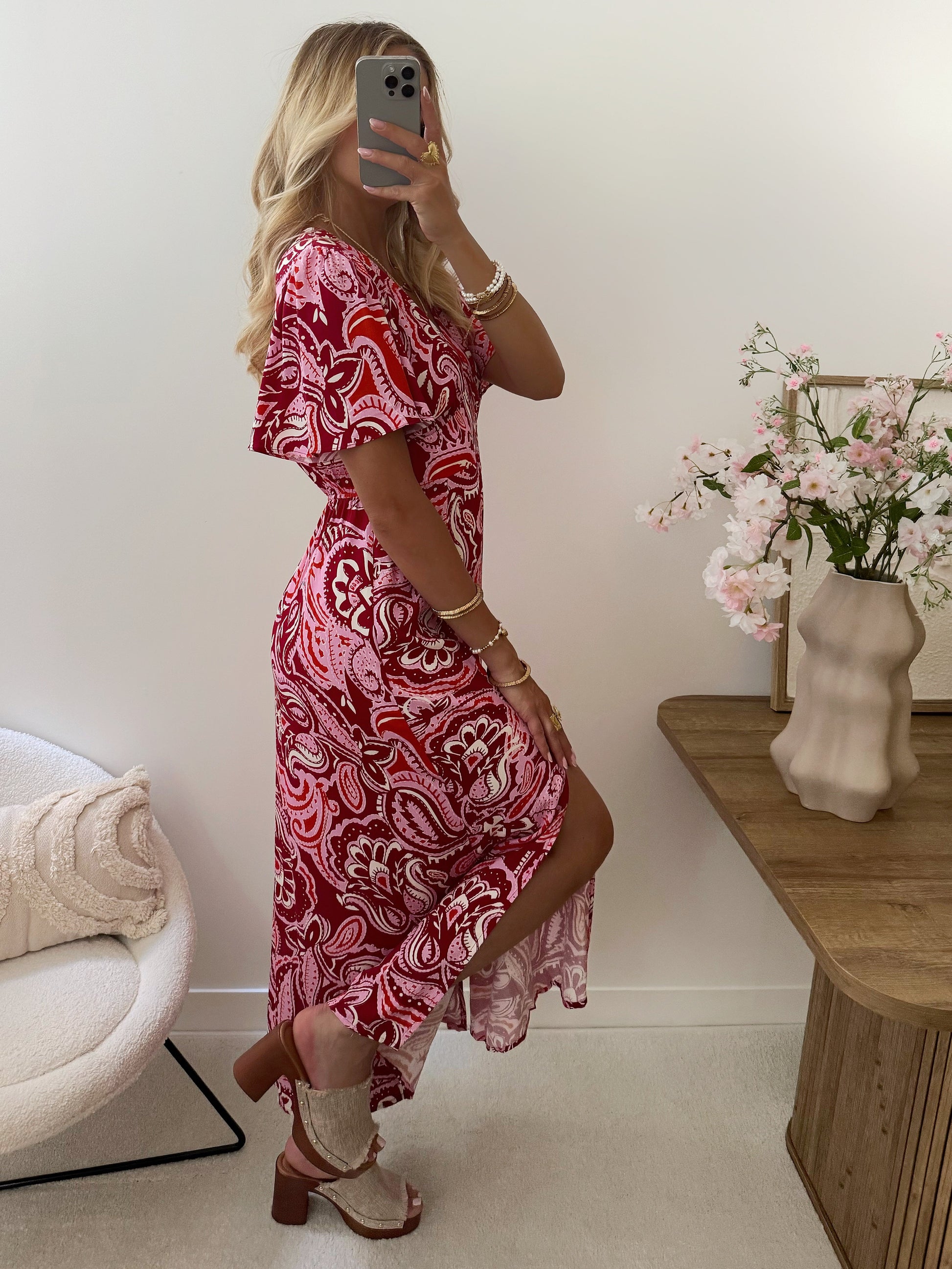 Elegant and easy to wear, the JANÉRO printed maxi dress combines comfort and femininity. Its V-neckline enhances the bust, its flared cut flatters the figure, and its short sleeves add lightness. The elasticated waistband at the back ensures a comfortable fit, while the cutouts at the front add a modern touch. Ideal for day or evening.