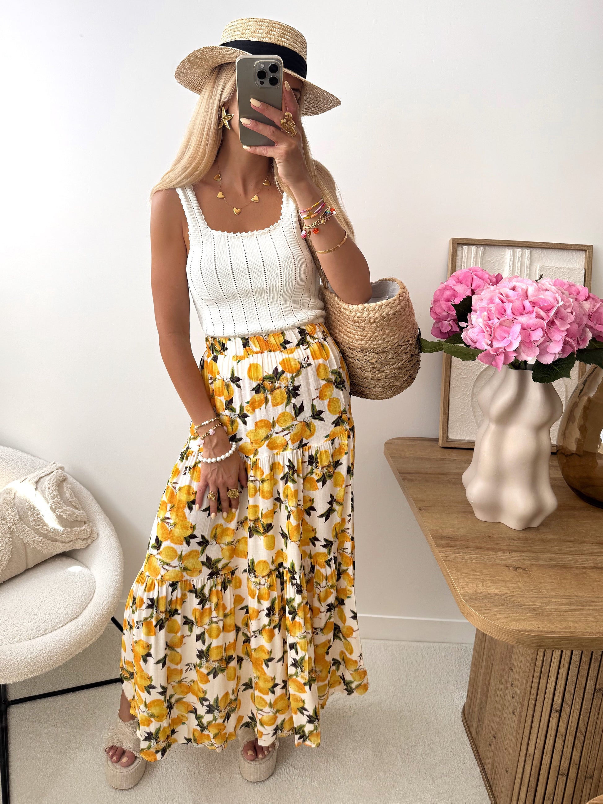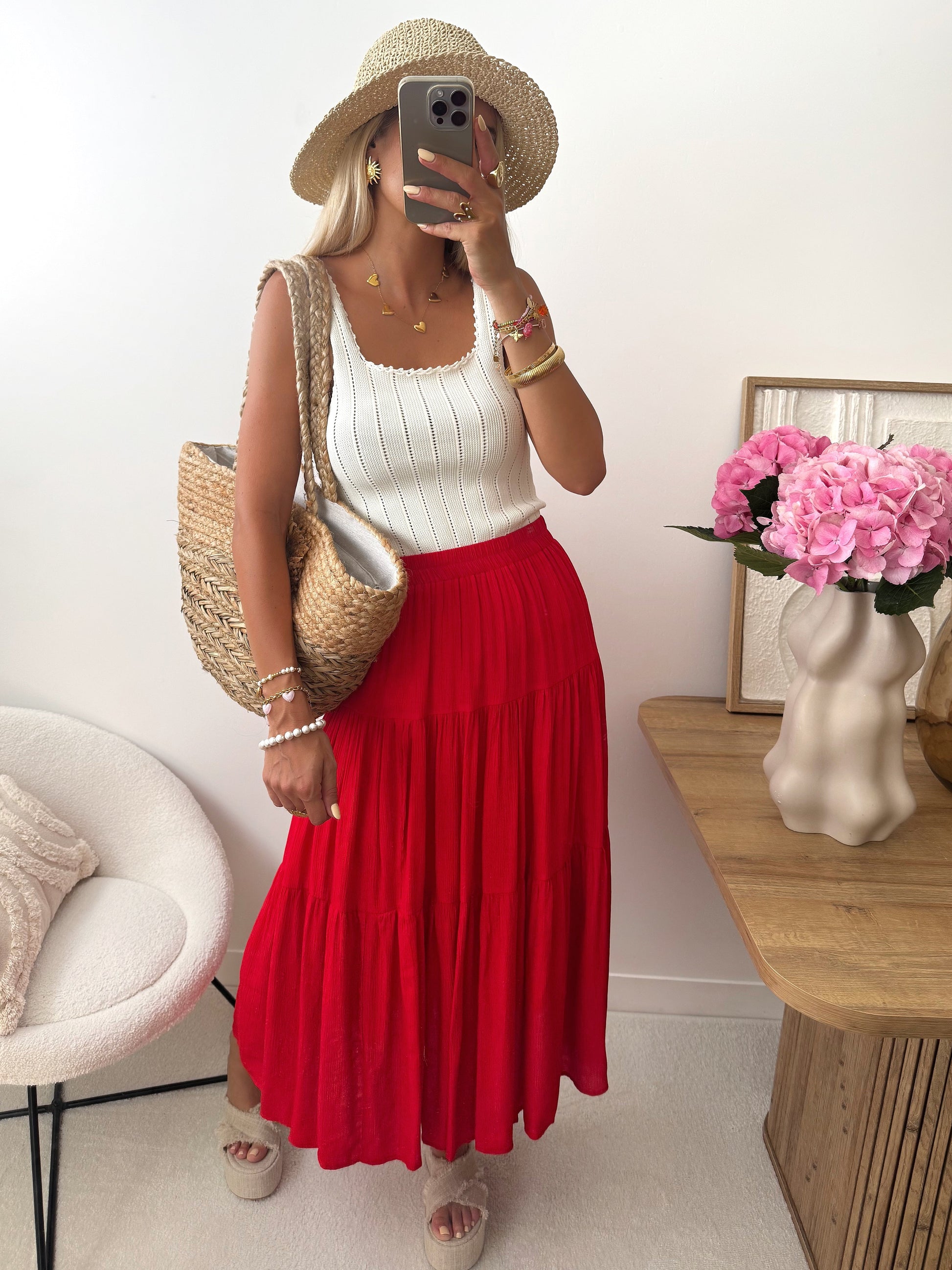 The AVETIS square-neck top features a charming openwork knit and ribbed finish, creating a feminine yet textured silhouette. The thin straps complete its lightweight look, making it ideal for sunny days.