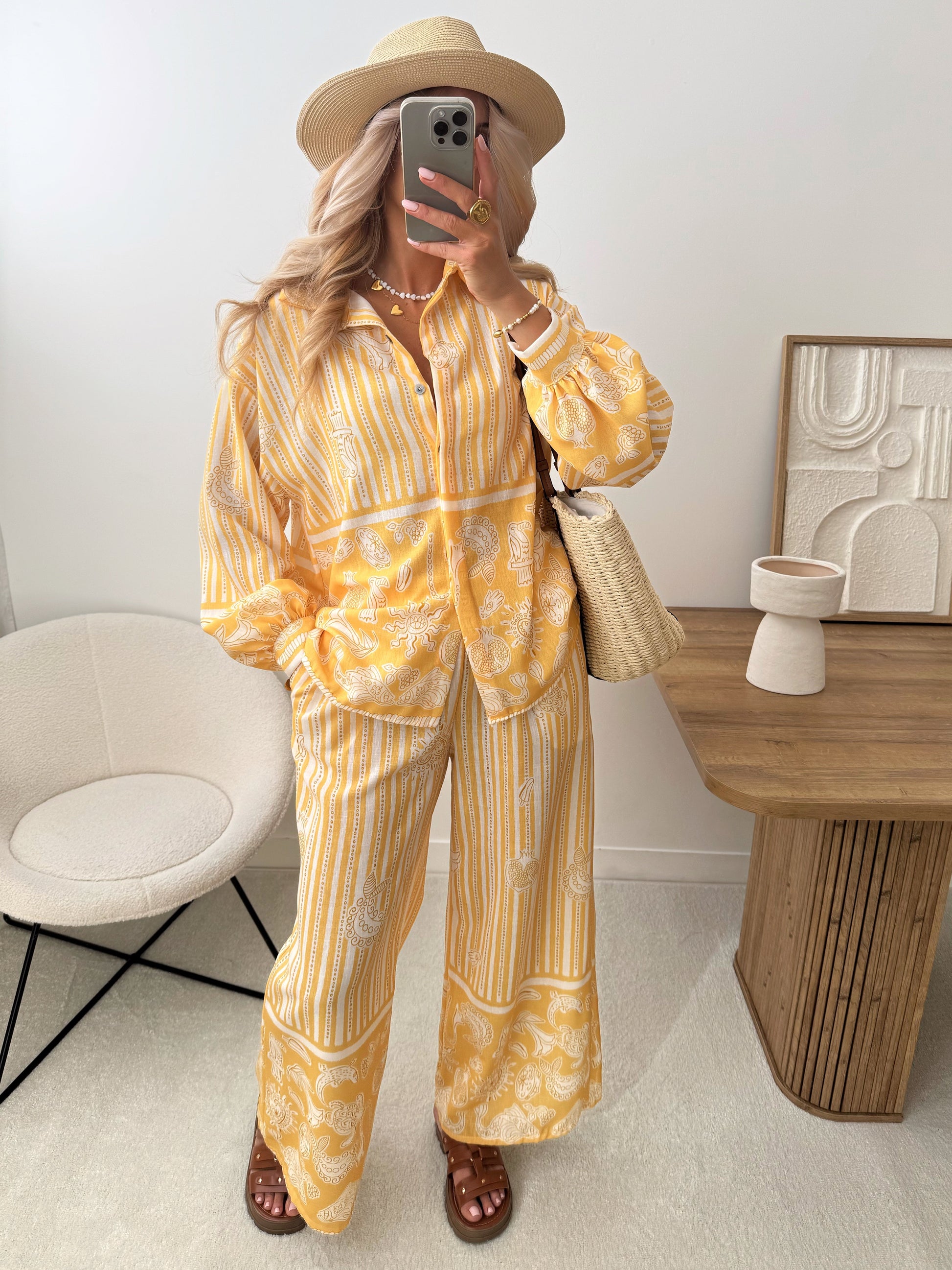 Our unique print set, consisting of a long-sleeved shirt and linen-blend trousers, perfectly combines comfort and boldness. The lightweight, flowing fabric offers a pleasant and breathable feel, ideal for sunny days. The original, unique, and modern print draws attention while adding a creative and artistic touch to the outfit. The long-sleeved shirt, with its loose fit, creates an elegant and relaxed silhouette, while the oversized trousers ensure comfort and freedom of movement. This set is perfect for those seeking a contemporary and trendy style.