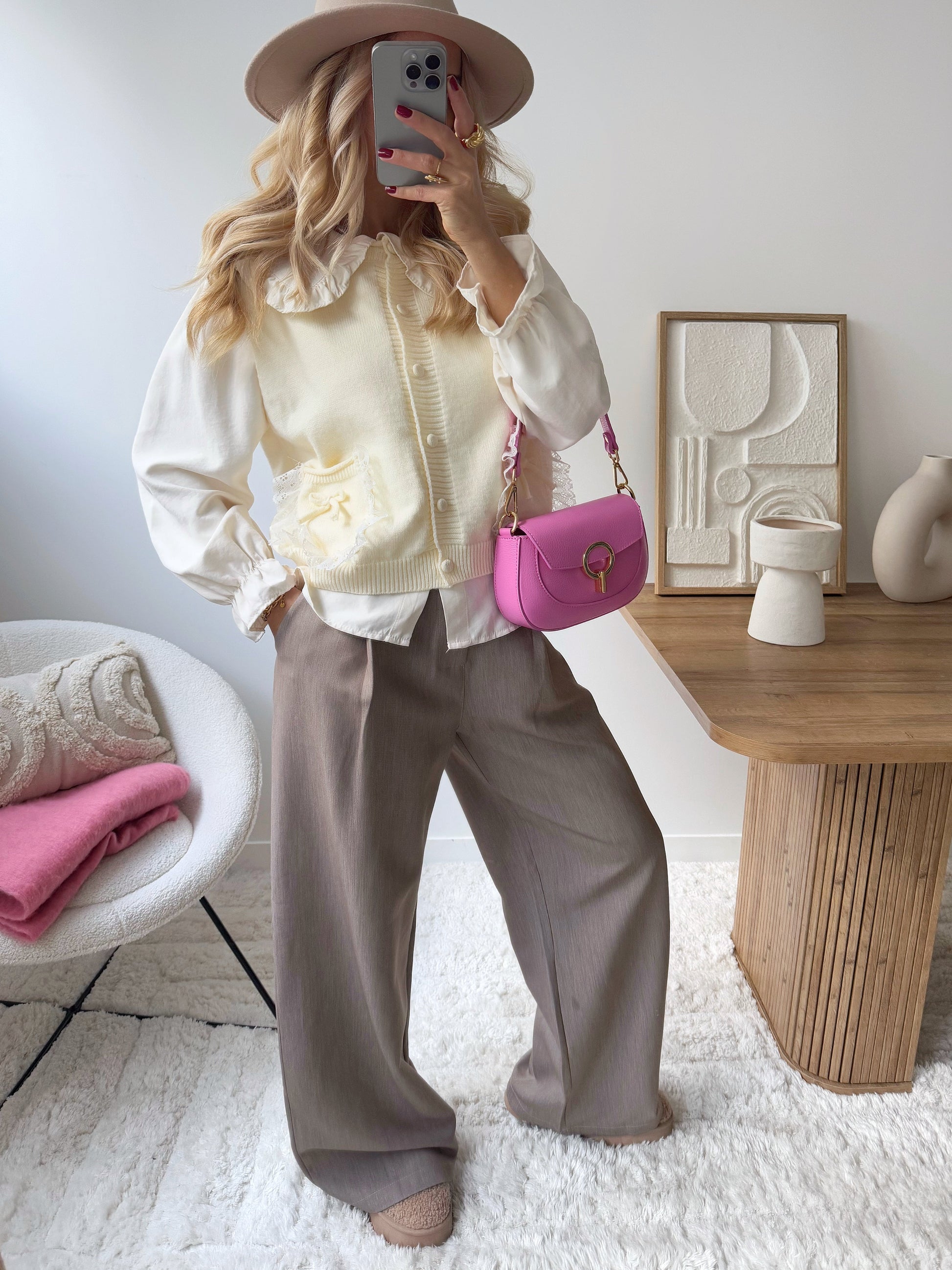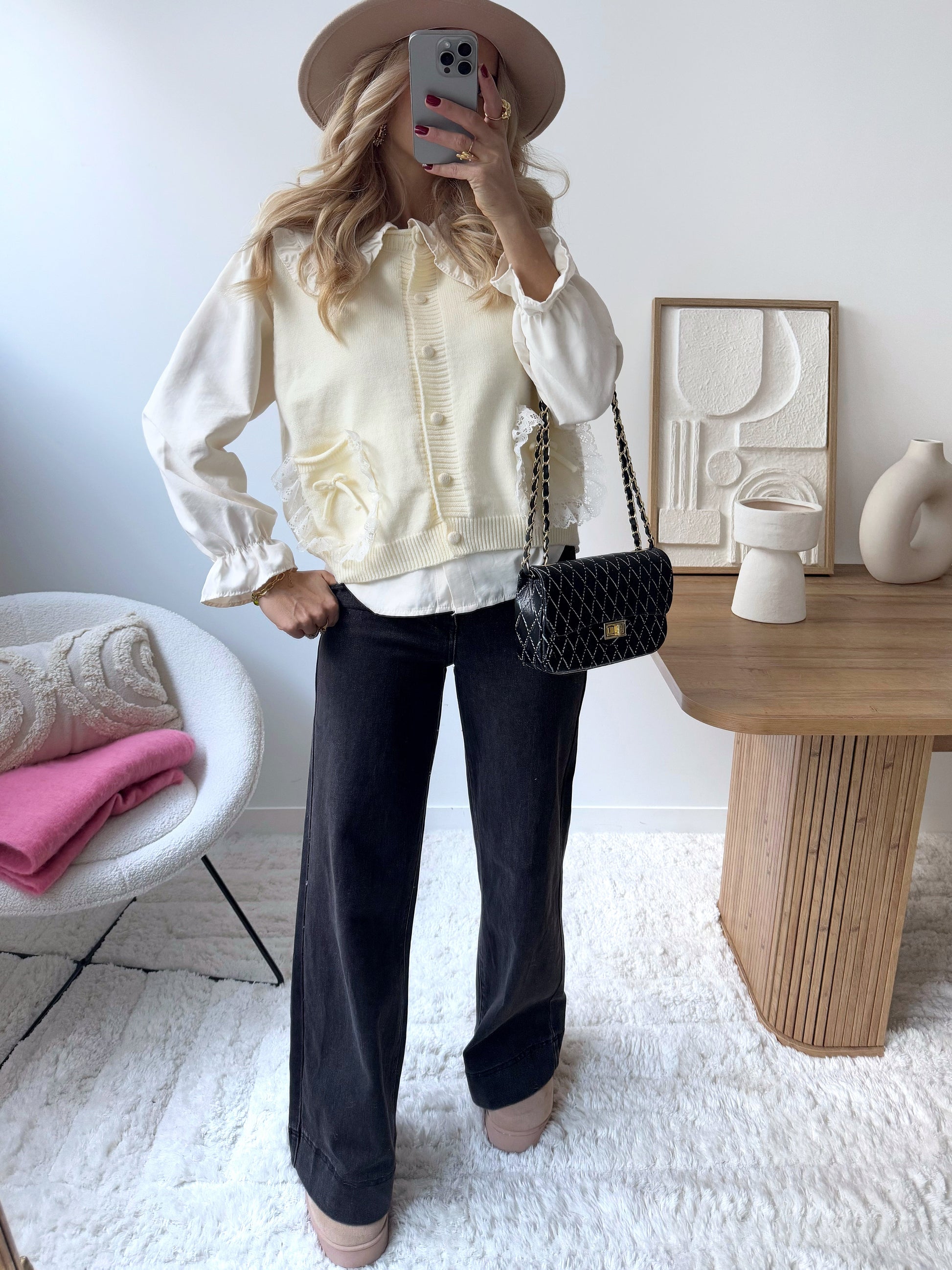 Combine elegance and comfort with the BETHEL dual-fabric knit sweater, a sophisticated piece for your wardrobe. The ruffled Peter Pan collar adds a delicate, feminine touch, while the ruffled elastic cuffs add a refined finish. The button placket allows for a practical and modern fit. The two patch pockets adorned with bows and lace add a lovely touch of style and texture, perfect for a chic yet classic look. Crafted from a soft and comfortable knit, this sweater is ideal for enhancing your casual outfits while remaining elegant.