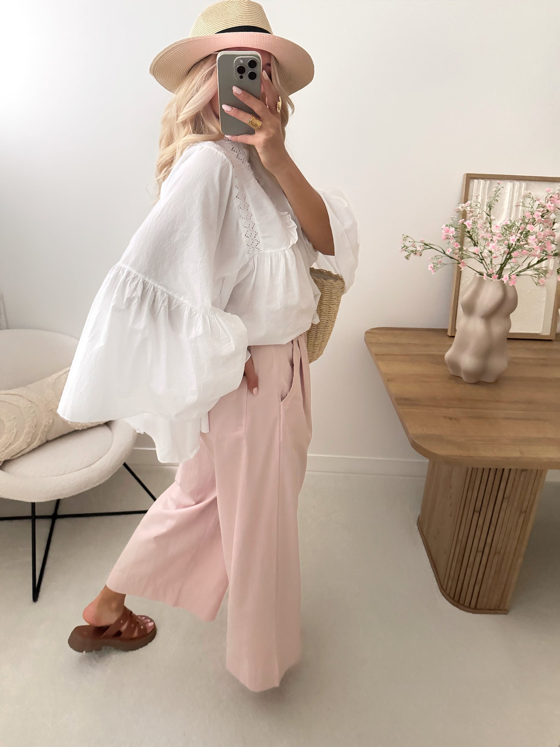 Combine structure and fluidity with these straight-cut, culotte-effect pants, designed to combine comfort and elegance for everyday wear. Featuring pleats on the front, they flatter the figure without restricting it, and offer a beautiful fit. The waistband is equipped with belt loops to slip in a belt as desired, while the elasticated back ensures a comfortable fit and optimal ease of movement. Practical without compromising style, these pants have Italian pockets on the sides, and two patch pockets on the back, for a casual chic touch. This style adapts to all desires: wear it with a tucked-in blouse for a soft office look, or with a fitted top and sandals for a more relaxed and contemporary look. It also lends itself to layering with a flowing blazer or a lightweight knit in between seasons. A must-have for the modern wardrobe, perfect for those who like to combine feminine allure, comfort, and a tailoring spirit effortlessly.