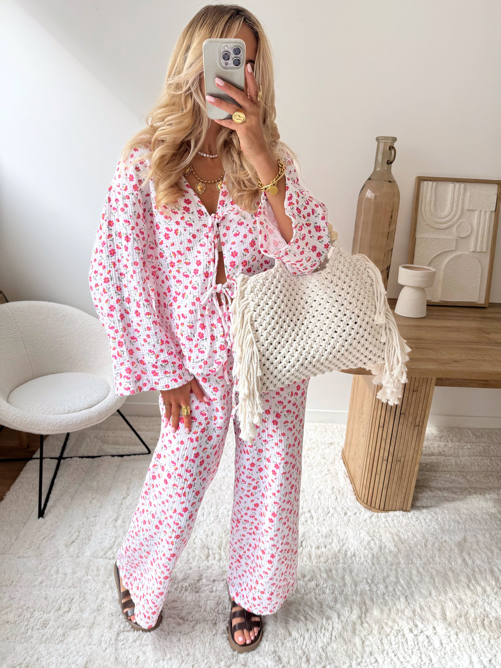 Our KAM cotton gauze pants combine comfort and elegance in a lightweight, airy piece. Their soft, flowing fabric delicately hugs the silhouette while offering complete freedom of movement. The subtle yet vibrant floral print adds a touch of freshness and femininity, perfect for adding color to your spring or summer outfits. With their slightly wide, relaxed fit, these pants embody a chic yet easy-to-wear style, ideal for a casual or more dressy look, depending on the occasion. An elegant piece that invites lightness and softness. You can pair them with our ALCO top.